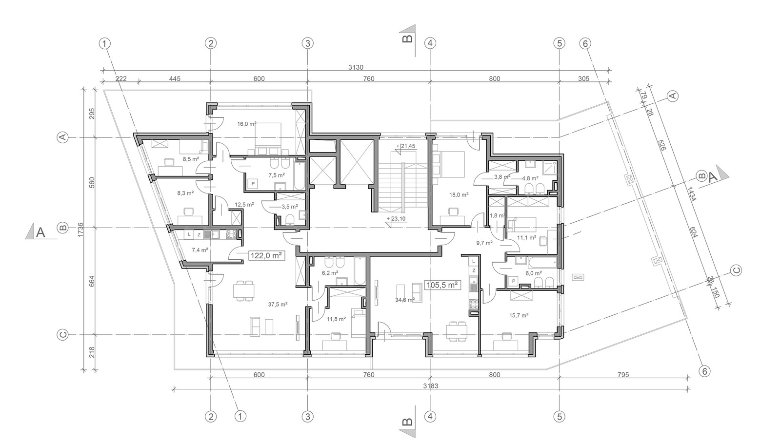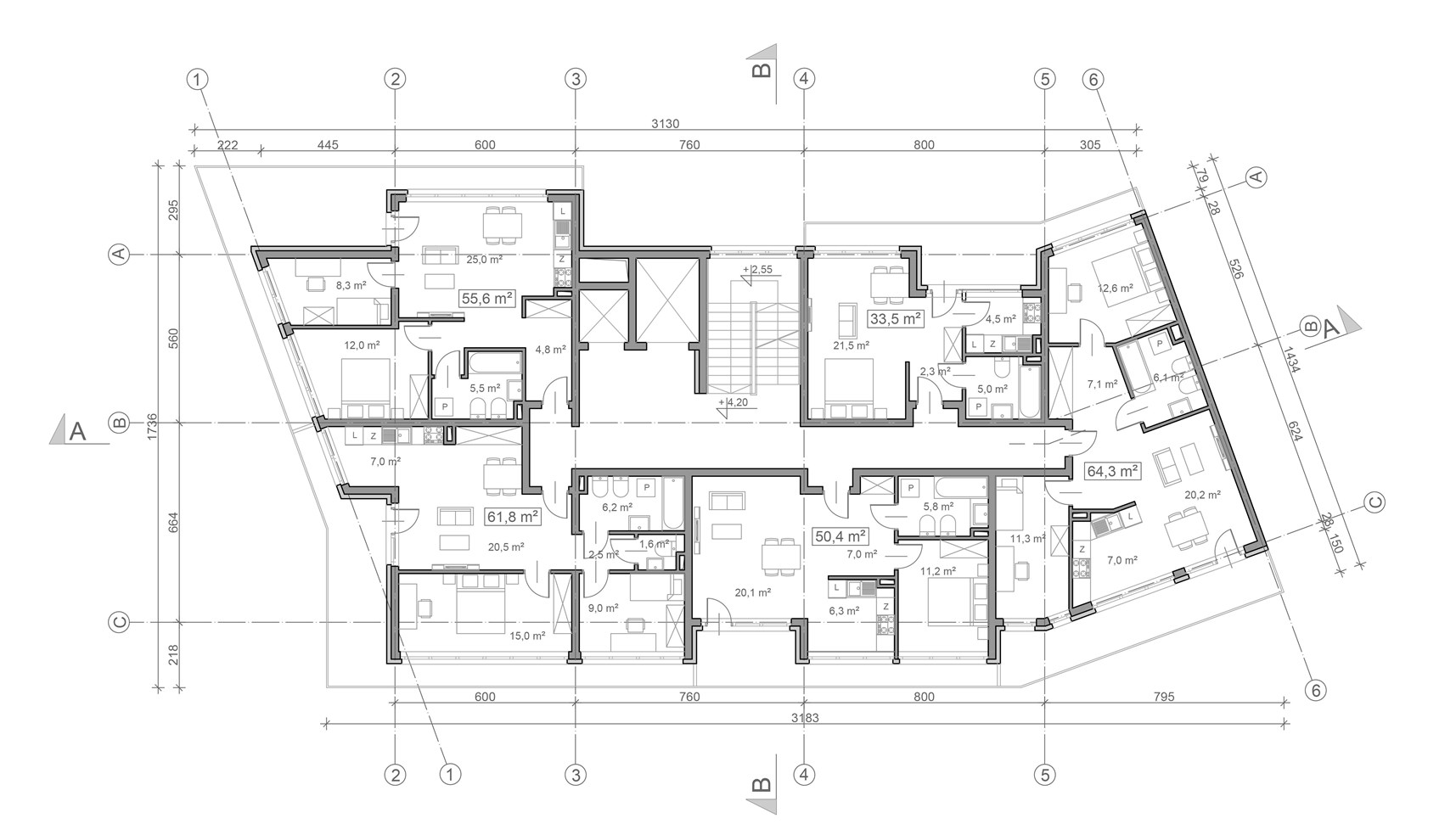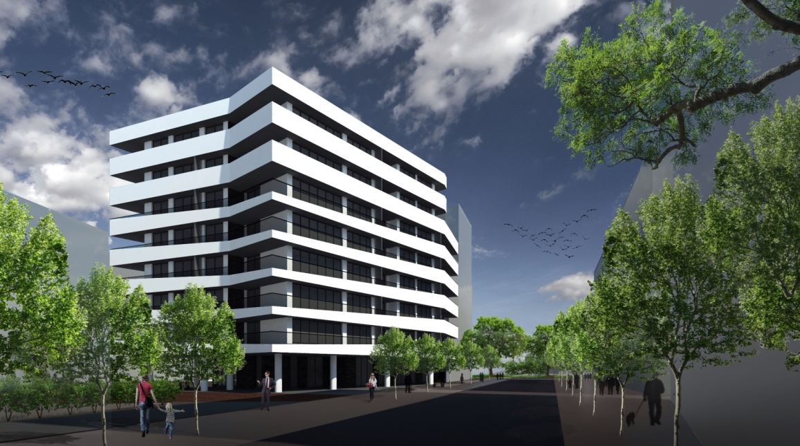 Układ urbanistyczny zespołu mieszkaniowego zaprojektowany wspólnie z grupą studentów miał na celu współgrać z istniejącym stanem zabudowy oraz być spójnym z miejscowym planem zagospodarowania terenu. Ukształtowanie formy budynków nakierowuje bądź akcentuje punktu ważne w otoczeniu. Moja część zabudowy wielorodzinnej zaprasza do wewnętrznego dziedzińca zespołu, aby wzmocnić ten efekt nadałam architekturze poziome elementy, które przez kilka kondygnacji zwężają się w kierunku dziedzińca. Pasmowość elewacji została uzyskana dzięki zastosowaniu balkonów wokół mieszkań. Specjalnie zaprojektowana część balkonowa nadaje nowoczesności i czystości architekturze.