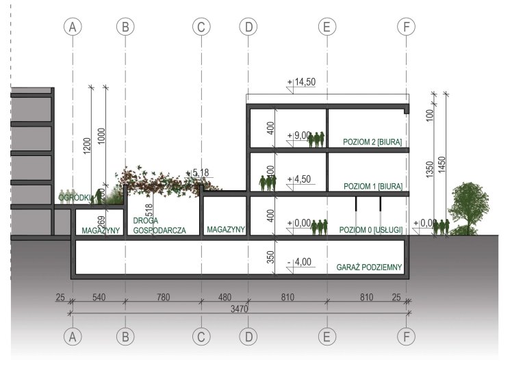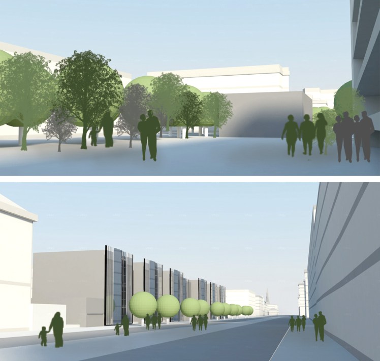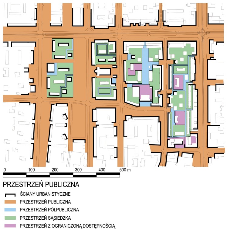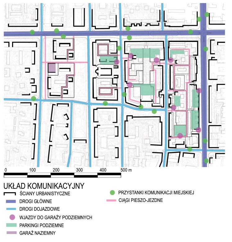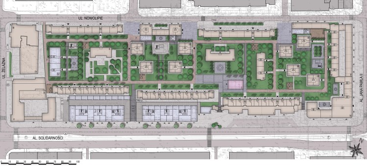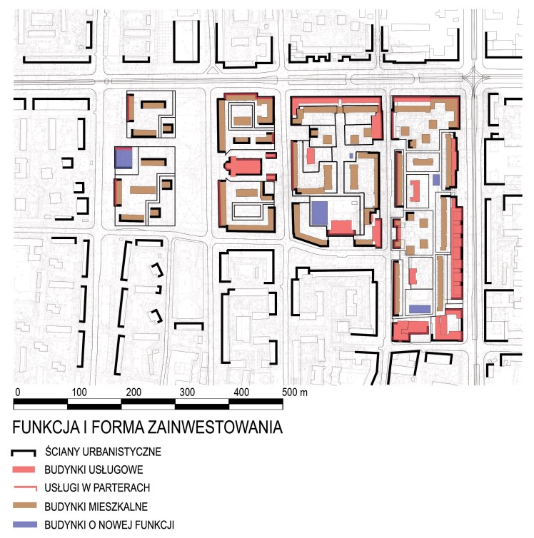 Wewnątrz kwartałów znajduje się zabudowa mieszkaniowa, na zewnątrz budynki wzbogacone o funkcję usługową. Do parterów budynków przy ul. Nowolipie zostały wprowadzone usługi. Budynek zlokalizowany przy ul. Nowolipie 29 został przeprojektowany na funkcję restauracyjną, np. kawiarnia. Pierzeja Al. Solidarności została uzupełniona 3-kondygnacyjną zabudową usługowo-biurową. Wprowadzono nową zabudowę: pawilon wystawowy, budynki gospodarcze, budynek o funkcji hotelowej, wspierający osoby odwiedzające rodzinę w okolicznym szpitalu.
