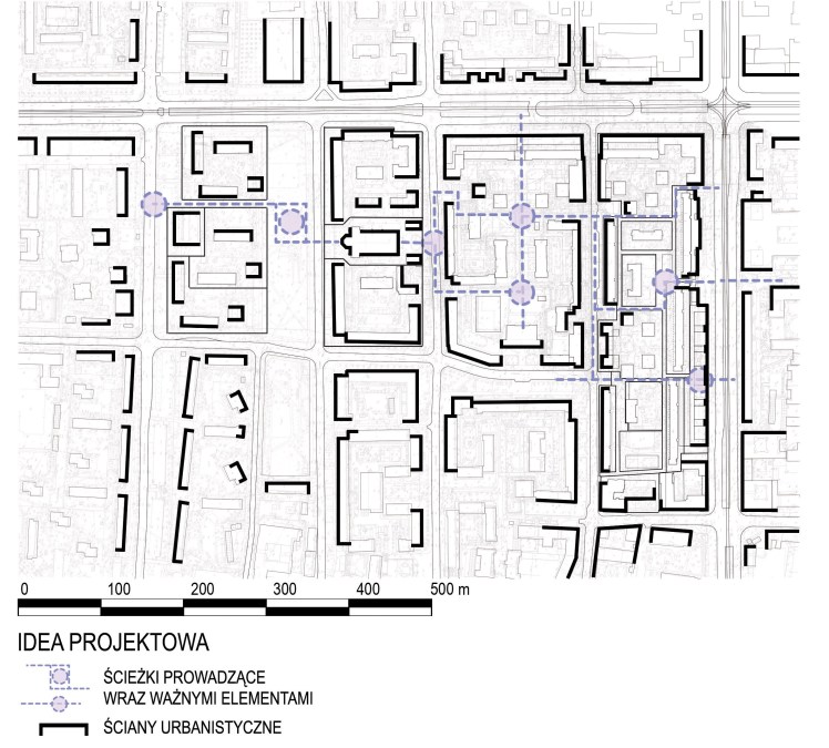 Koncepcja projektowa opiera się na uwypukleniu historii, poprzez ścieżki pamięci idące przez cały opracowany obszar. Wzdłuż jednej ze ścieżek jest zaprojektowany plac z pawilonem wystawowym, na podłoże urbanistycznej są wprowadzone historyczne fundamenty budynków przedwojennych.