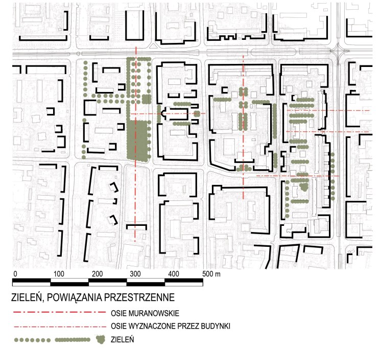 Projektowana zieleń została tak ukształtowana, aby podkreślić ścieżki wiodące przez opracowywany teren. Szpalery drzew, jako ściany zielone dodatkowo wydzielają przestrzenie sąsiedzkie.