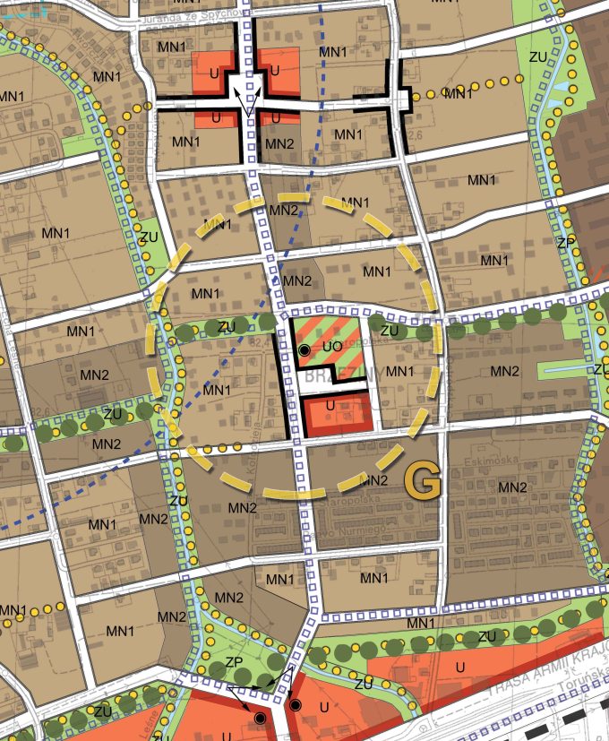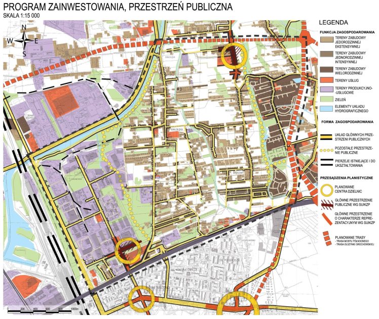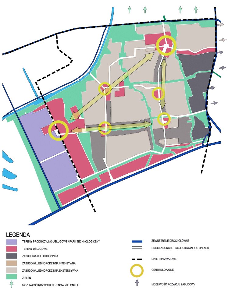 Struktura przestrzenna obszaru została uporządkowana. Wprowadzono centra lokalne istniejące od strony zachodniej. Strefa po zakładach przemysłowych została przekształcona na park technologiczny, oddzielony od zabudowy jednorodzinnej pasem usługowym oraz pasem zieleni parkowej z usługami oświaty i kultury. Od trasy toruńskiej zabudowę jednorodzinną oddziela pas usług. Zaprojektowano 2 placówki oświatowe, obiekt kultury i ośrodek sportowy.