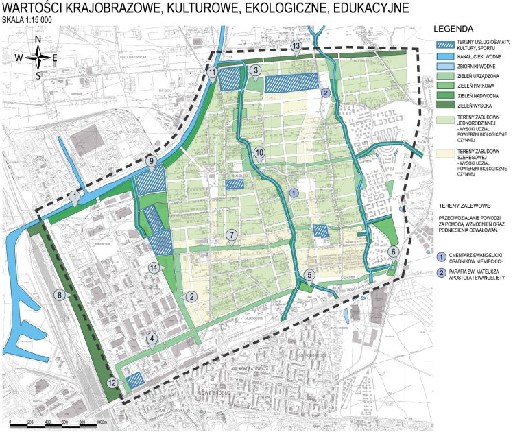 W koncepcji zaprojektowano czytelną strukturę zieleni. Wprowadzono rekreacyjną przestrzeń wzdłuż istniejących cieków wodnych, w postaci ciągów zielonych z poszerzeniami.