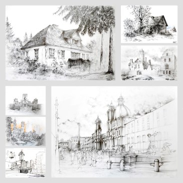 Rysunki wykonane za pomocą cienkopisów, ołówka, kredek oraz flamastrów. Format rysunków to 35cm x 50cm oraz 50cm x 70cm.